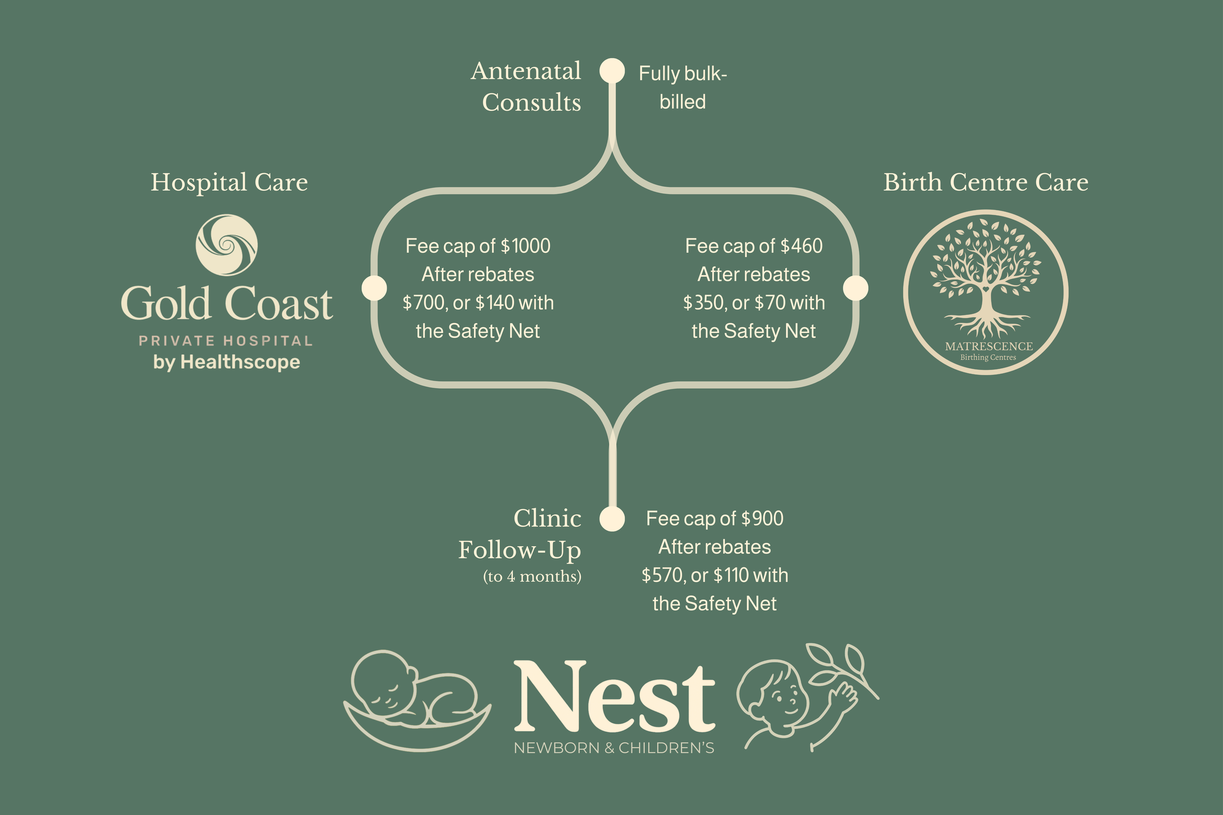 Hospital care fees are collected at your 6-week clinic review, giving you time to register your baby with Medicare first. Clinic review fees are collected at each appointment. In both cases, we process your Medicare rebate at the same time – minimising how long you're out of pocket.